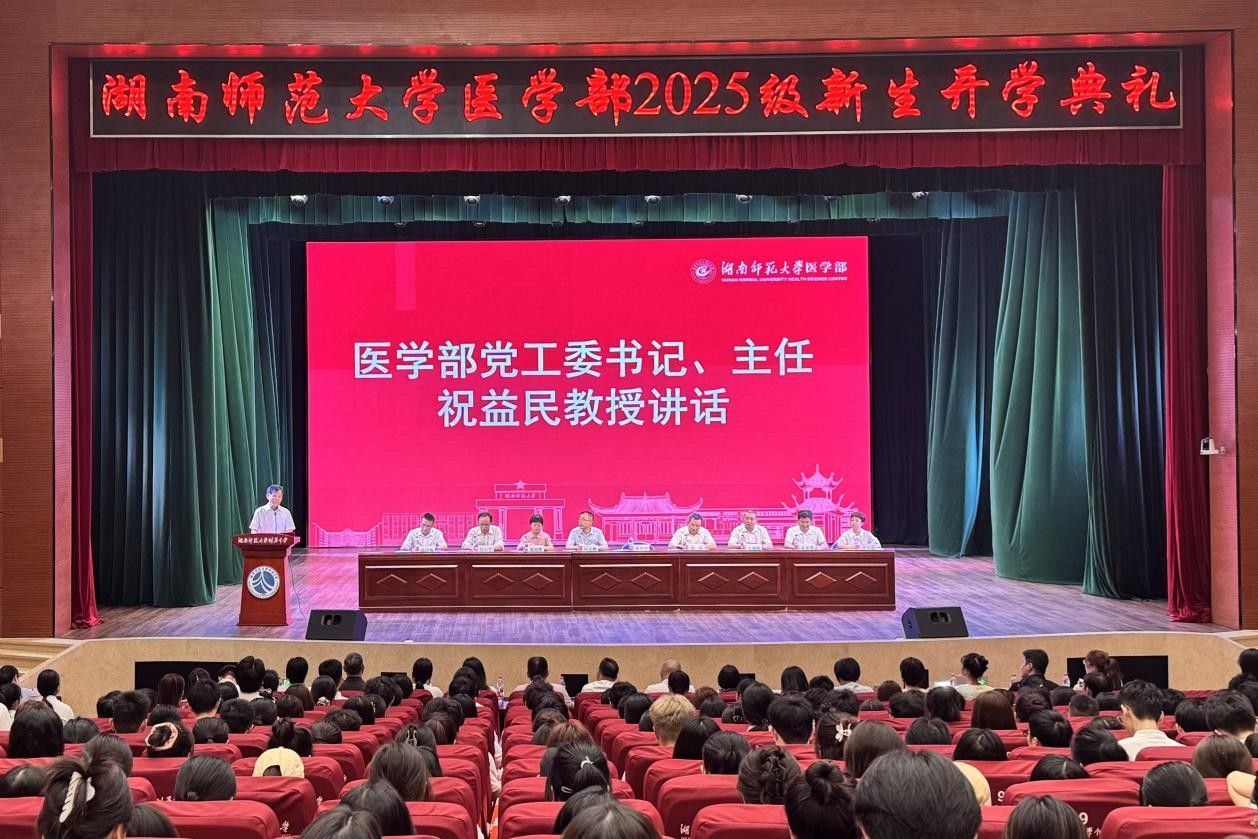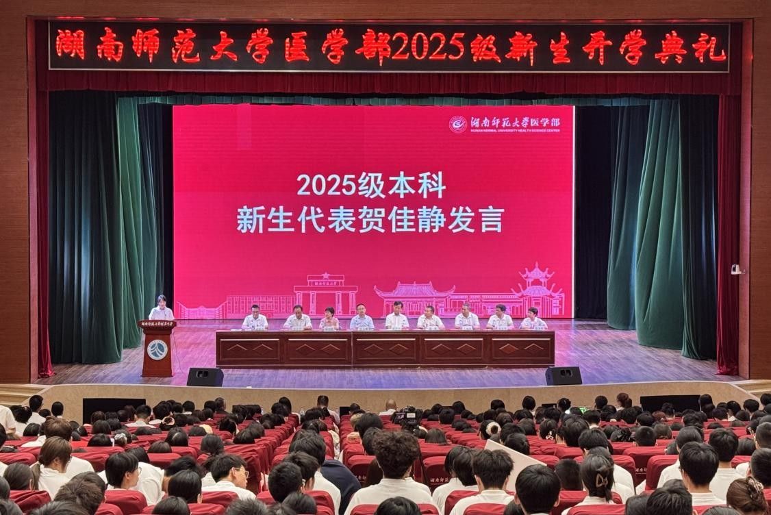 云天收夏色,木叶动秋声。9月15日上午,医学部2025级新生开学典礼在湖南师范大学附属中学孟其楼礼堂隆重举行。医学部党工委书记、主任祝益民,常德职业技术学院党委副书记、院长周华,岳阳职业技术学院党委委员、副院长付高勤,常德职业技术学院党委委员、副院长王朝晖,医学部党工委副书记鄢朝晖,医学部医学人才与学科建设处处长孙岳兵,医学部医学科技处处长彭小宁,湖南省人民医院急诊三部ICU护士长、校友徐芙蓉等出席典礼,典礼由学生工作办公室主任郭铭伟主持。