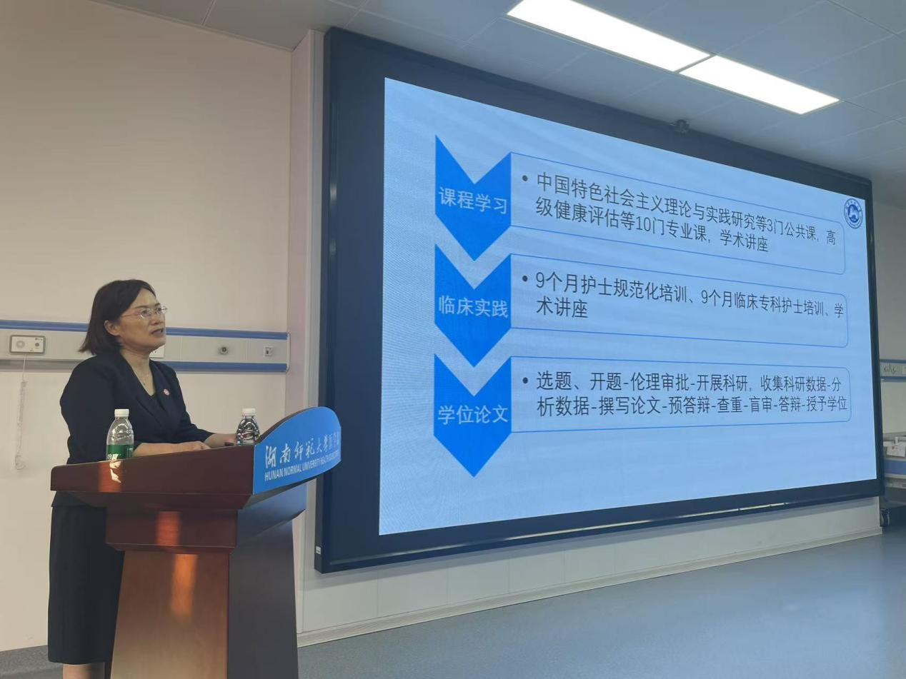 王卫红教授为新生详细介绍学科建设情况和未来发展规划。她从学科底蕴、特色优势、研究方向及培养计划等方面展开阐述,系统梳理了护理学院近年来在学科建设上取得的丰硕成果,阐述了培养计划的核心内容,生动描绘了学科未来的发展蓝图。王卫红教授强调,研究生阶段是探索护理学前沿、追求学术真知的关键时期,希望同学们珍惜学院提供的优质资源,明确学习目标,勇于探索创新。丛丽副教授以真挚而温暖的话语,向新生们分享了自己的教学经验与育人理念。她寄语新生要保持“谦逊求教、主动交流”的态度,在科研探索中培养批判性思维和团队合作精神,同时始终铭记护理事业所蕴含的仁爱之心。