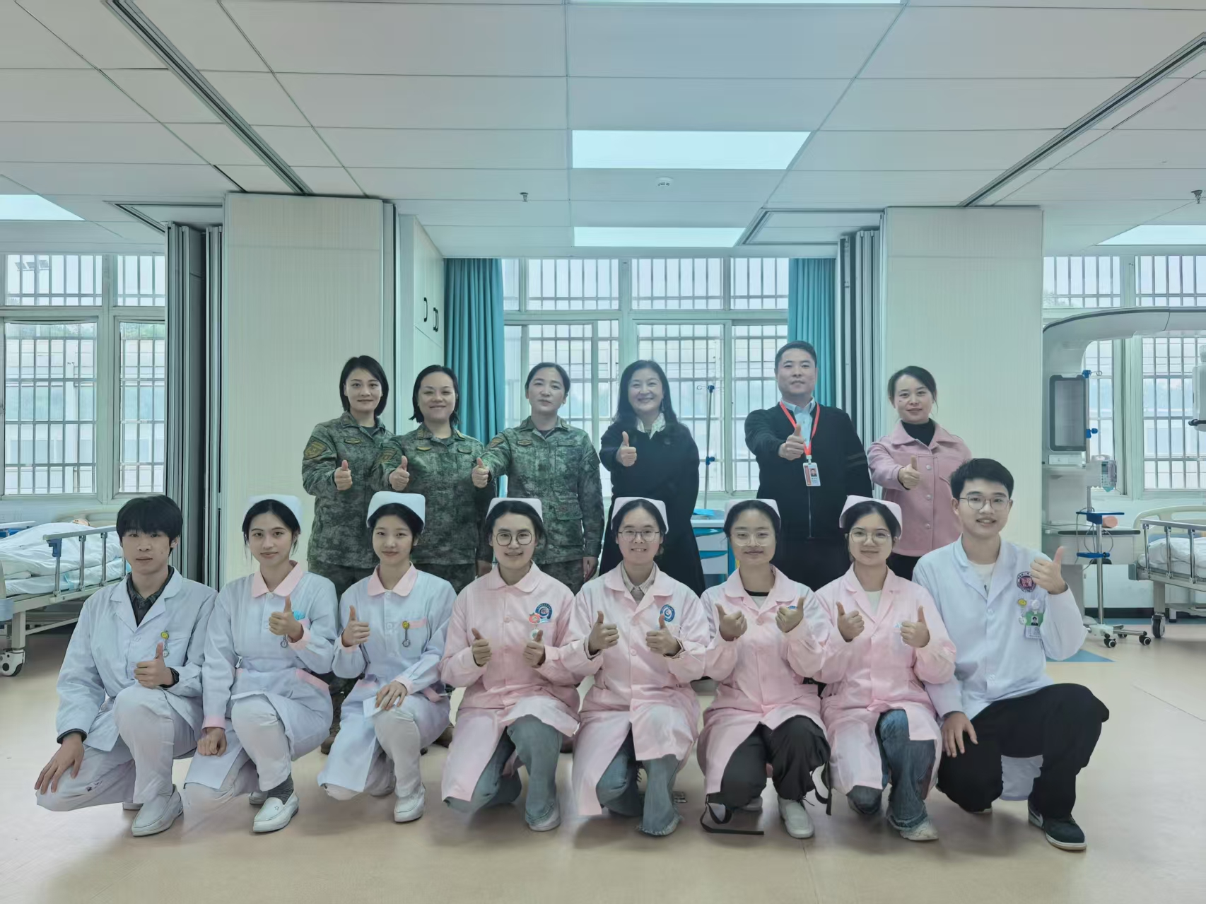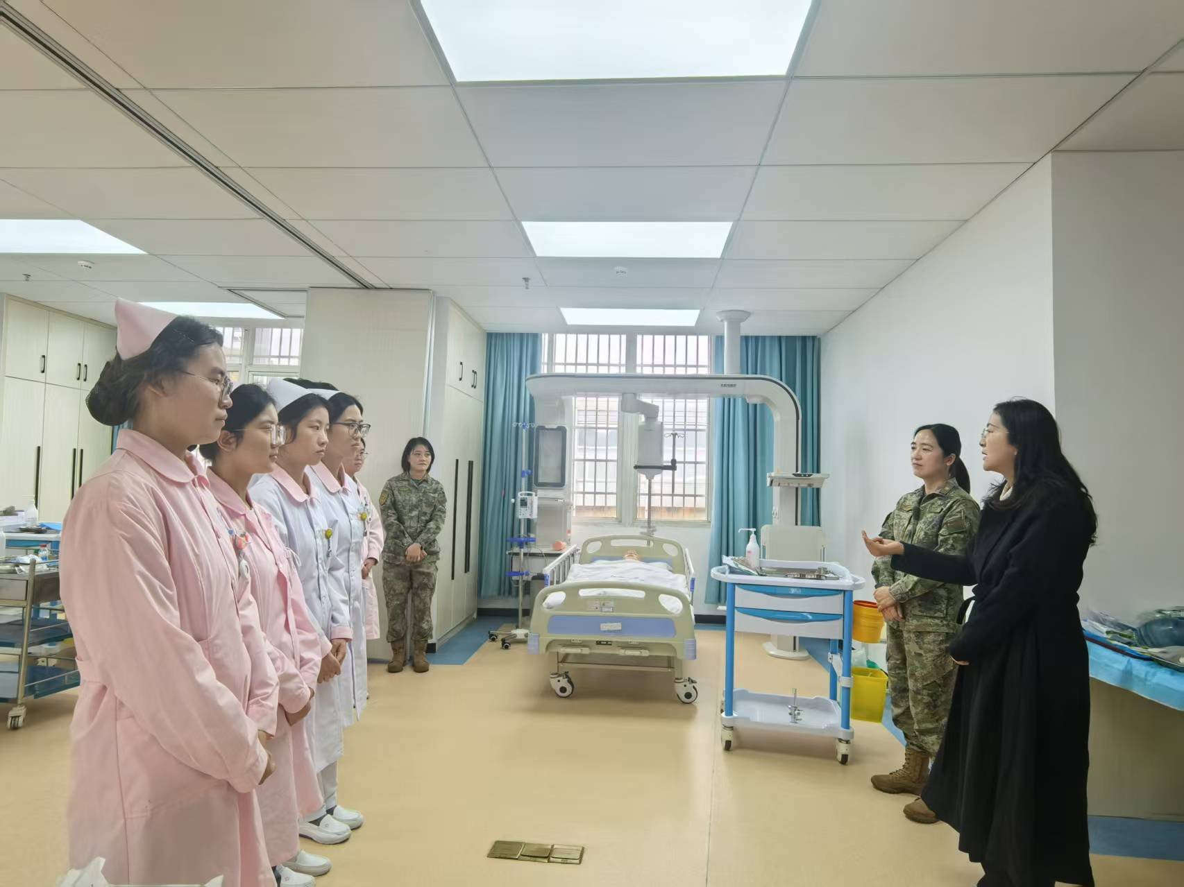 何院长与湖南师范大学第二附属医院护理部李婷主任、驻培办徐力杰主任、护理部袁园总护士长、护理部毛丹助理以及急诊科张瑛护士长等人来到选手们备赛训练的现场,细致了解了同学们的集训进展和生活情况,并对他们展现出的刻苦钻研、精益求精的精神风貌给予了高度赞扬。