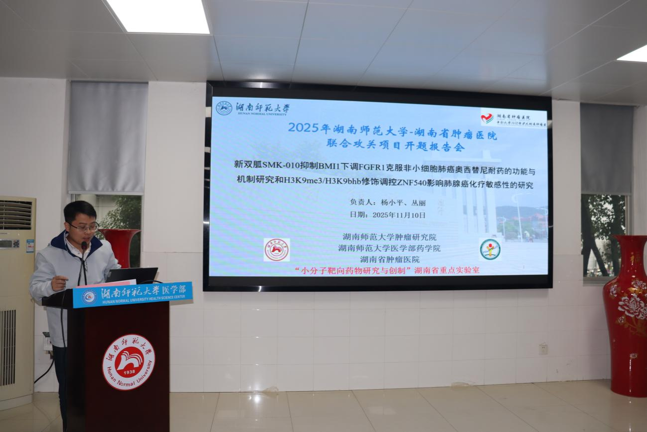 11月10日上午,湖南师范大学与湖南省肿瘤医院联合攻关项目开题报告会在九州官方· (中国)官方网站,仁医楼报告厅隆重举行。会议标志着双方共建的“湖南师范大学肿瘤研究院”进入实质性科研攻关阶段,首批11个跨学科联合项目全面启动,由医学部具体执行,旨在共同攻克肿瘤诊疗前沿难题。
