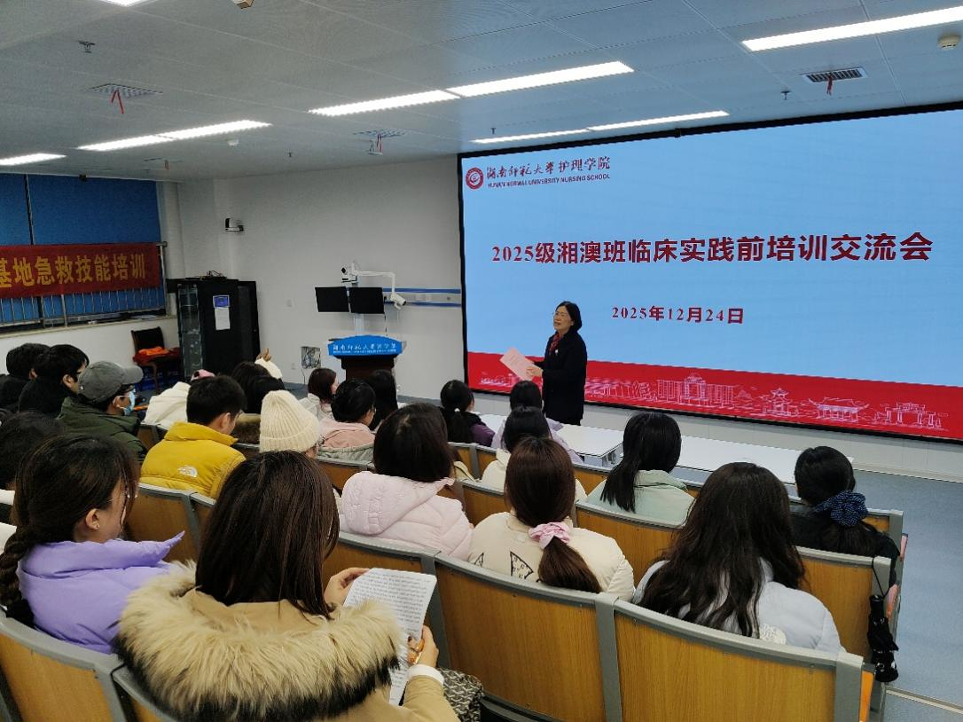 为夯实2025级湘澳班护理学专业研究生临床实践根基,明确实践全流程要求与考核标准,确保实践环节高质量有序开展,12月24日,护理学院成功举办2025级湘澳班护理学专业临床实践前培训交流会。护理学院王卫红副院长、班导师丛丽副教授及2025级湘澳班全体研究生参加本次会议。
