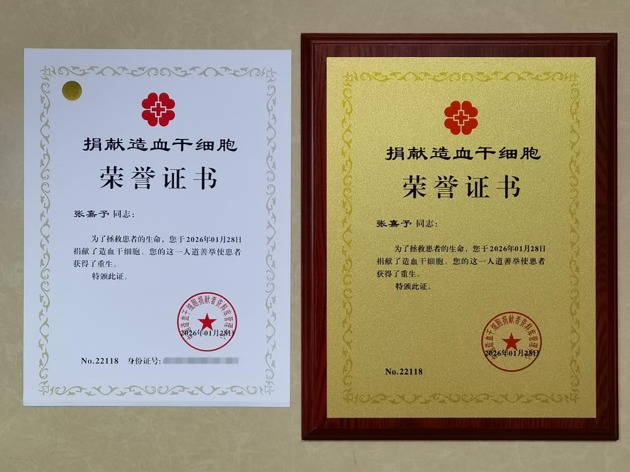 2026年1月28日,我校医学部2021级临床医学专业张嘉予同学在湖南省人民医院(湖南师范大学附属第一医院)顺利完成造血干细胞捐献,成为医学部第五位成功捐献者,其捐献编号为22118。这位00后医学生在紧张的考研备考期间,以坚定的意志克服身体波折,最终成功为一名素不相识的血液病患者送去“生命火种”,用行动深刻诠释了“健康所系,性命相托”的医学誓言。