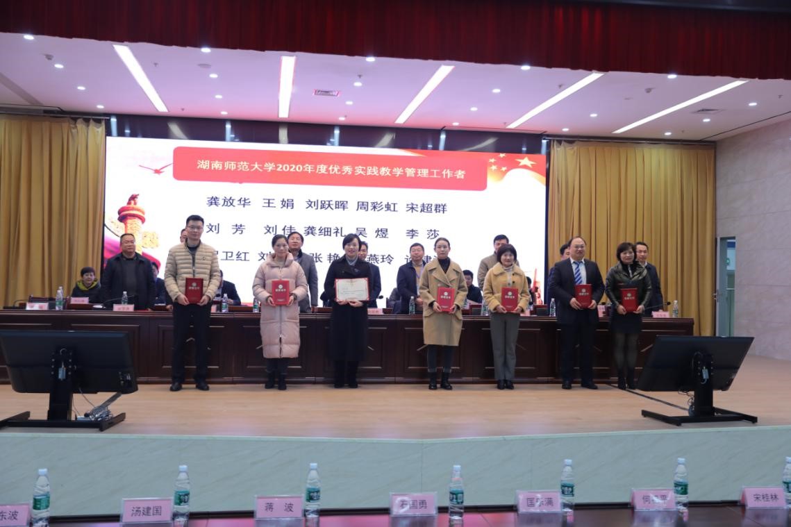 教务处秦建新副处长宣布表彰了湖南师范大学2020年度优秀教学管理工作者、优秀带教老师和优秀实习生的决定,副校长匡乐满、省卫健委科教处处长石国勇、我院院长何祖平、临床医学院院长蒋波、附属长沙医院院长宋桂林、附属长沙市妇幼保健院院长王东波等为获奖者颁发荣誉证书。