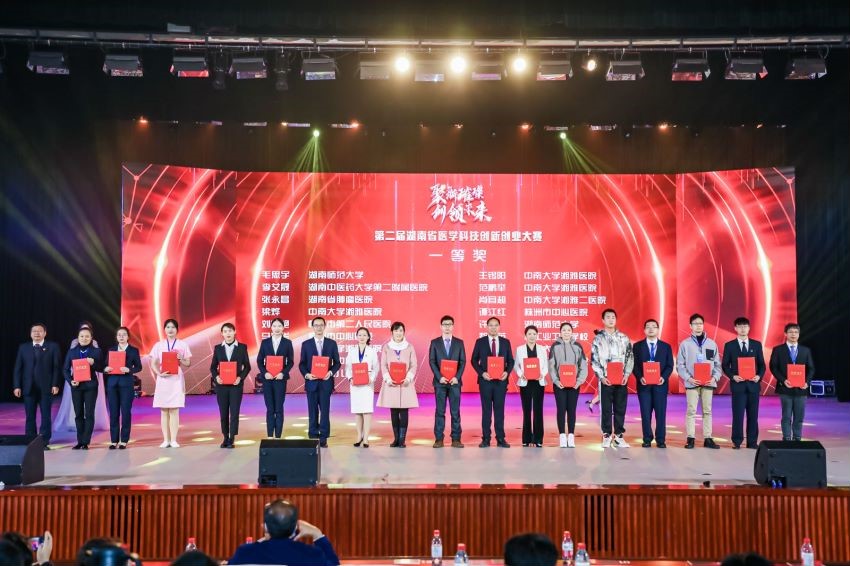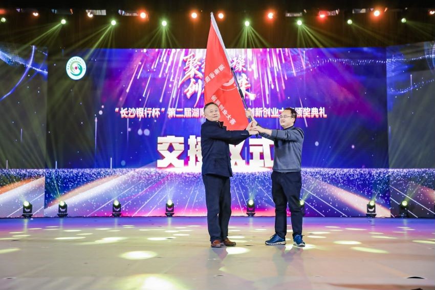 12月5日晚,在长沙人民会堂举办了《聚新璀璨·创领未来》“长沙银行杯”第二届湖南省医学科技创新创业大赛颁奖典礼。湖南省政协副主席、南华大学校长张灼华、湖南省科技厅副厅长周建元、湖南师范大学副校长、湖南医学教育科技学会副会长匡乐满、湖南中医药大学副校长、湖南医学教育科技学会副会长葛金文、湖南省人民医院、湖南师范大学附属第一医院院长李小松、湖南省卫生健康委员会科教处处长石国勇、长沙市岳麓区副区长李舜、长沙银行股份有限公司营业部行长陈富华等领导嘉宾出席了本次颁奖典礼并为获奖者颁奖,湖南省卫生健康委员会副主任祝益民通过视频表达了对本次活动的肯定和对我省医疗科研人员的关怀,中南大学创新创业教育办公室主任杨芳点评大赛,党委办主任李学荣代表我校将赛旗授予南华大学。