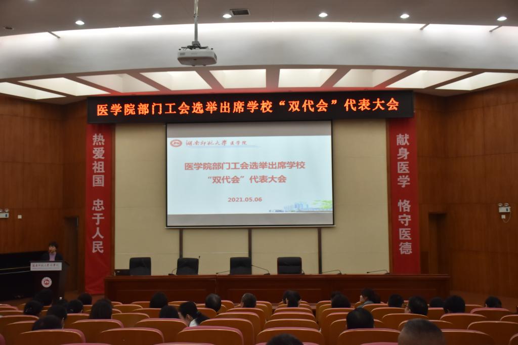 2021年5月6日下午,我院部门工会选举出席学校“双代会”代表大会在仁医楼学术报告厅隆重举行。校党委委员、党委组织部部长沈又红、院长何祖平、院党委书记鄢朝晖、副院长张坚松、邓文艳、党委副书记陈松出席会议。会议由我院分工会主席袁仕善主持。