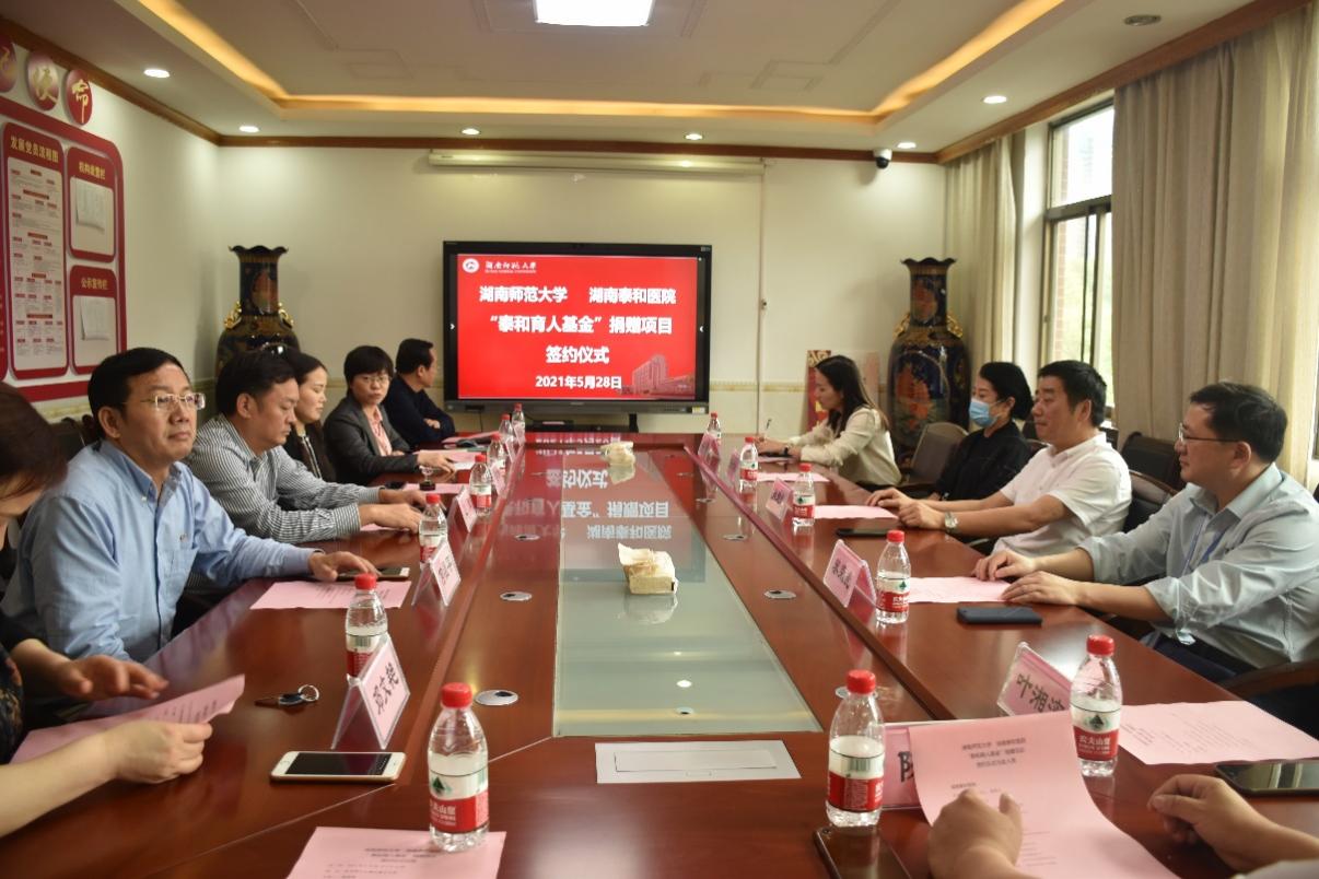5月28日下午,湖南师范大学与湖南泰和医院在我院办公楼四楼会议室举行“泰和育人基金”捐赠项目签约仪式。湖南师范大学副校长王辉,湖南泰和医院党委书记兼董事长肖迪武、护理院长安如俊、副院长兼心脑血管中心主任黎荣虎、院长助理兼地外事务部主任王谦,校友总会教育基金会副秘书长刘芸玲,我院院长何祖平、副院长张坚松、邓文艳、党委副书记陈松、院长助理叶湘漓出席签约仪式。我院党委书记鄢朝晖主持仪式。