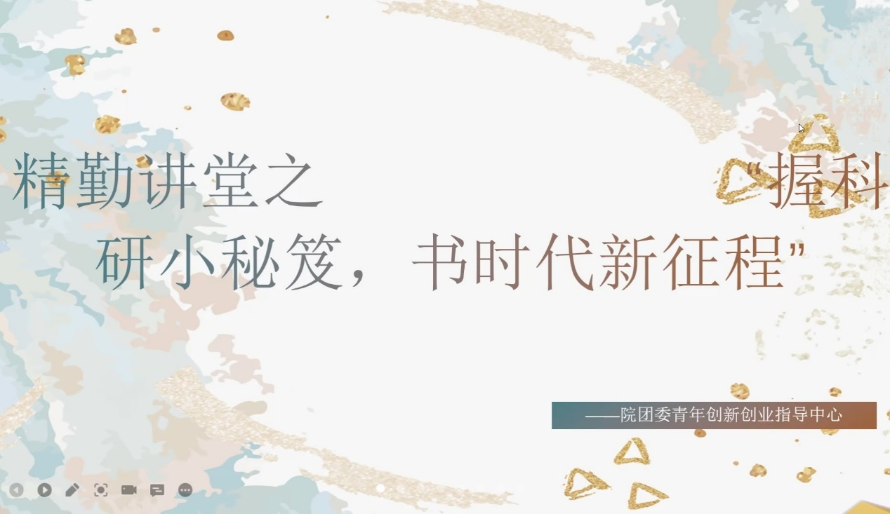 3月18日晚上,我院团委青年创新创业指导中心在腾讯会议线上开展“握科技小秘笈,书时代新征程”主题精勤讲堂。此次讲座由21级临床一班雷灵林主持,邀请到19级药学班刘恩泽主讲,我院部分本科生参加此次讲座。