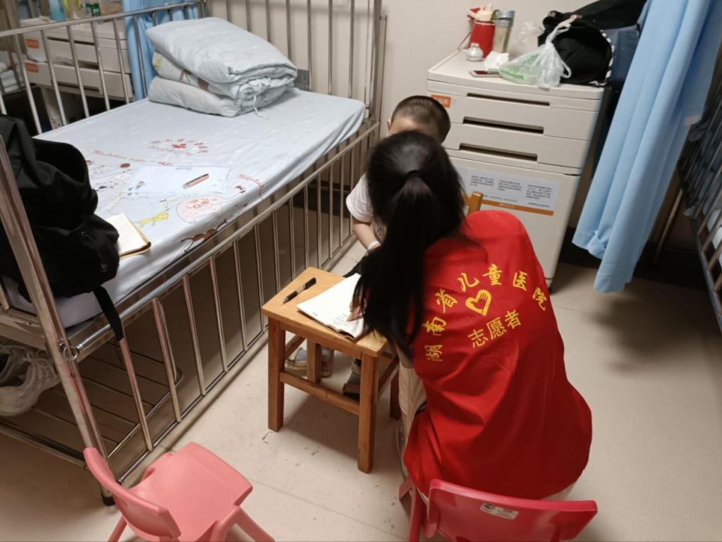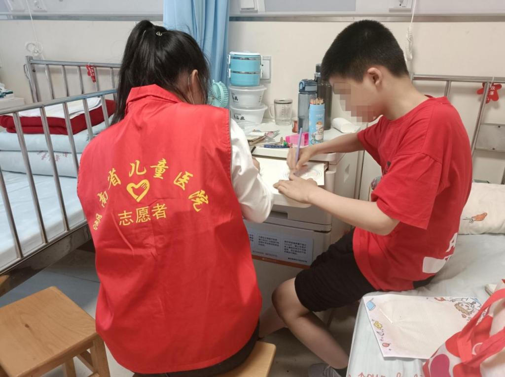 活动当天是母亲节,志愿者们提前到达湖南省儿童医院领取志愿服,与医院的活动负责人沟通好注意事项后,便分为两组开展活动。一组志愿者拿出提前准备好的纸和笔,和孩子们一起制作母亲节贺卡。孩子们个个踊跃参与,发挥自己的想象力,制作了一份份别致的母亲节贺卡,为母亲送上自己的祝福。另一组志愿者则对孩子们的学校作业以及课堂学习中遗留的难点问题,进行了耐心细致的讲解,循序渐进的引导帮助孩子们解决学习中的难题,有针对性地解决了孩子们在医院无人辅导课业的问题。