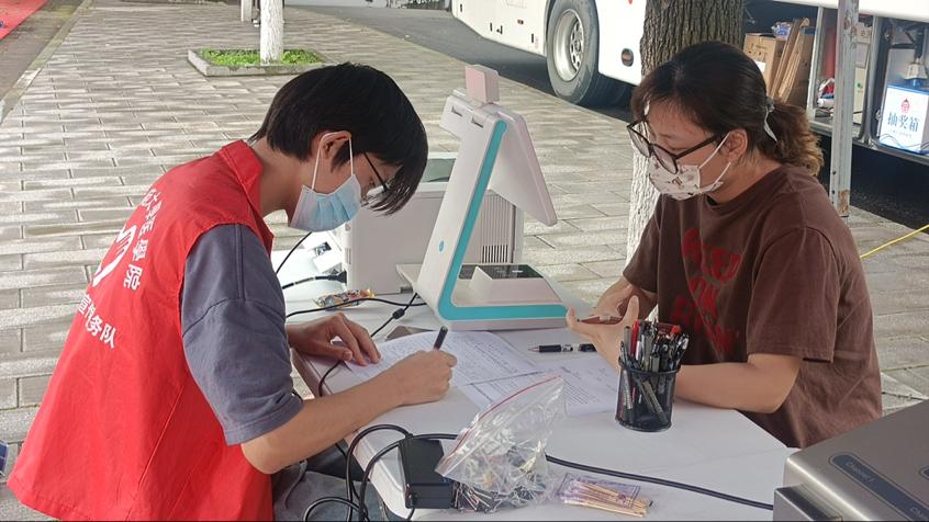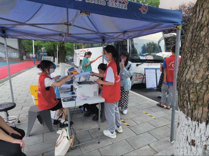 献血者们在献血车外的志愿者服务处有序排队。无偿献血队队员为学生讲述献血前后的相关注意事项,同时对于首次进行献血的同学提出的疑问进行了解答。在进行血液初步检查后,符合献血条件的学生在血站工作人员帮助与志愿者的引导下,有序完成了测量血型、血压等工作,进入献血车进行献血。在献血过程中,献血者认真聆听了工作人员的建议并配合完成了献血。