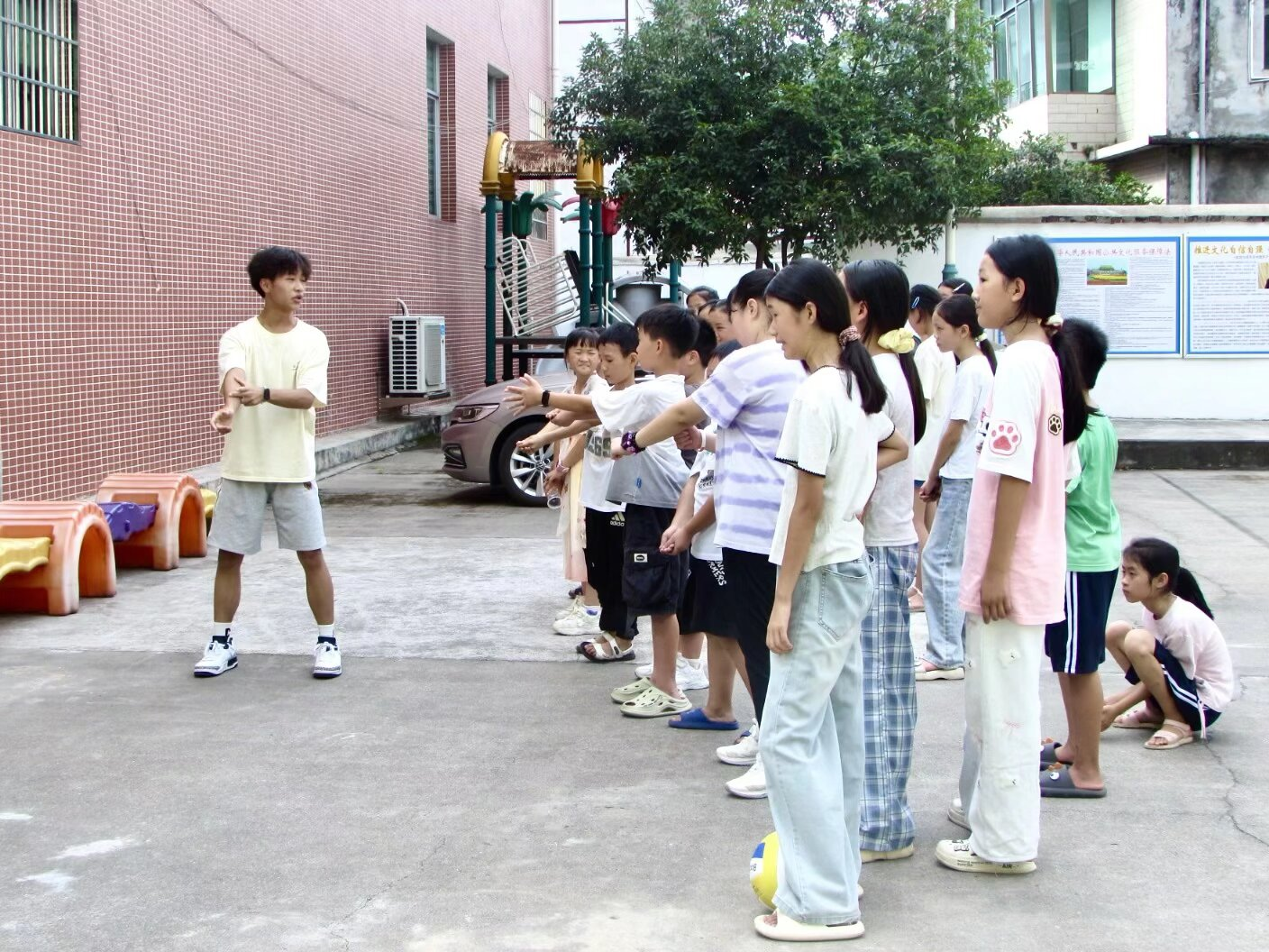 在排球课上,实践团成员戴恺用专业的指导,带领孩子们开启了排球初体验。他耐心细致地讲解垫球和传球的基本要领,从手型到发力点一一示范,确保每个孩子都能掌握正确姿势。为了让孩子们更好地掌握发力点,他还设计了趣味性的分组练习,帮助孩子们提升球感。