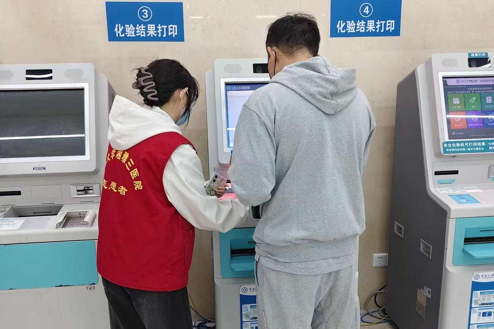 志愿者身着统一服装,在医院服务大厅及相关诊室开展志愿服务。他们分工协作,解答患者疑问,指引就诊路线,协助维持现场秩序,有效缓解了高峰时期医院导诊压力。针对部分患者不熟悉线上服务的情况,志愿者主动引导他们使用医院公众号、自助预约机等智慧医疗设备,帮助患者及其家属完成预约、挂号、缴费及查询等操作,提高了就诊效率。