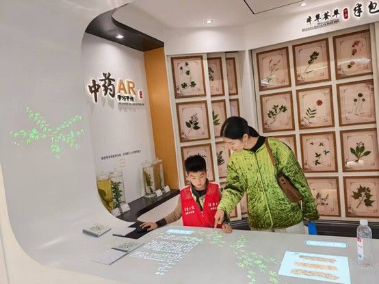 在上午的亲子活动中,孩子们在家长的陪伴下有序进入展馆。讲解员以通俗易懂的语言,带领大家依次参观了“杏林传薪”“本草荟萃”等主题展区。孩子们对仿古药具、浸制标本、腊叶标本表现出浓厚兴趣,尤其在“中药智慧互动教学平台”和“AR中药学习平台”前驻足体验,通过VR头盔“亲临”野外采药场景,通过3D全息投影观察药用植物的立体形态,在互动中感受中医药的博大精深。