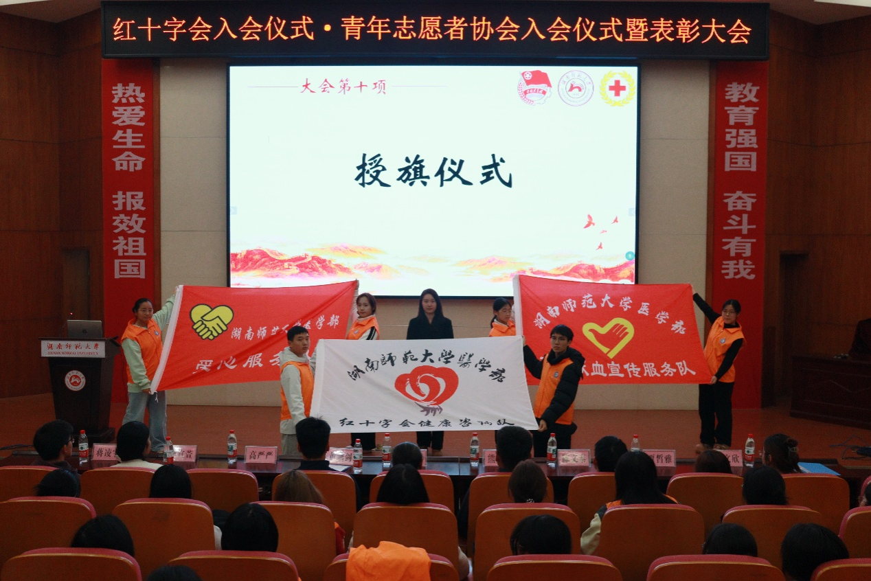 大会最后,陈旭为医学部青年志愿者工作部、红十字会授旗,熊永通为红十字会知行合医健康知识宣讲团、区校共建部授旗,高严严为无偿献血宣传服务队、爱心服务队、红十字会健康咨询队授旗。