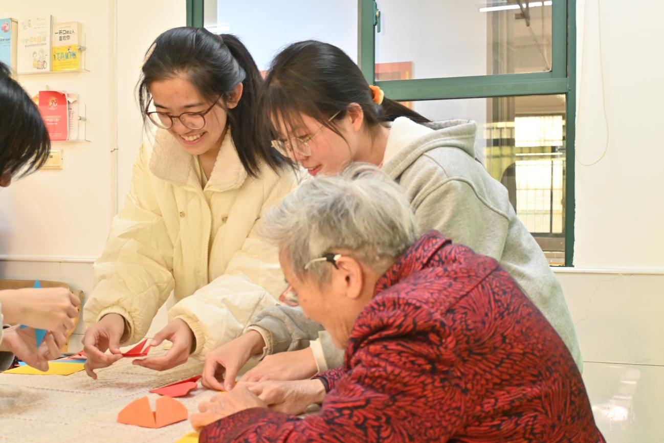 在本次志愿服务活动中,志愿者们组织并开展了形式多样的志愿项目,为老人们筹备了丰富文艺演出。志愿者们借助歌曲演唱、诗歌朗诵以及精彩的拳法展示,为现场的老人们带来了欢歌笑语,为其生活增添了乐趣。志愿者们手把手教授老人们折纸技艺。在折纸互动过程中,志愿者们不仅对每个步骤进行细致指导,还认真聆听老人们讲述他们丰富的人生阅历,涵盖年轻时的拼搏历程、工作中的难忘事迹以及岁月里的珍贵回忆。整个现场弥漫着温暖、关怀与和谐的氛围,拉近了志愿者与老人们心灵之间的距离。