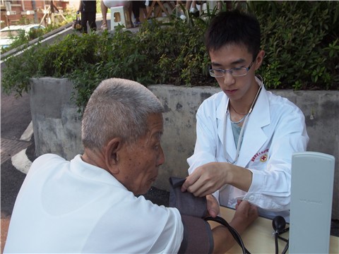 与此同时,健康咨询组的活动也在紧密进行中,龙王港社区居民积极主动,看到这里有义诊,都上前测量血糖血压,并进行健康咨询,健康咨询组组员也尽自己所知解疑答惑,为使队员操作水平更上一层楼,组长沈立在下午召开了精英培训,紧抓每个细节。