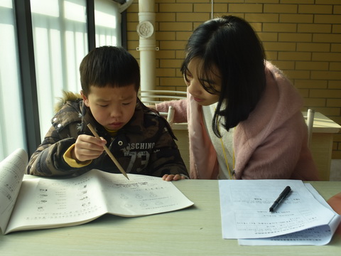 “来,把这个题目再读一遍!”“你看,你读懂了就做对了吧,下次记得认真读题。”“你就是这个图象题有问题。”在志愿者与小朋友的悉心对话中,小朋友们熟悉了诗句的读法,数学题的算法,汉字的写法。