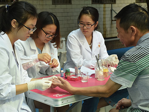 在此次义诊志愿活动中,义诊队队员的主要工作为帮社区居民测量血压、血糖,测试血型以及为社区居民普及健康常识和进行健康咨询。义诊进行时,队员们若发现有血压高和血糖高的居民,则会询问居民的饮食习惯和睡眠质量,同时根据实际情况给居民们提出建议,如平时不要吃的过于油腻,不要摄取盐量过多,更不能嗜烟酒,并且适当参加体育活动,加强锻炼,以促进血液循环等。对于情况较严重者,义诊队员还叮嘱他们平时生活起居要有规律,努力克服不良嗜好,积极治疗原发病,去除诱因,养成良好的生活习惯。值得一提的是,义诊地点旁有个社区活动中心,其正在举办亲子活动,期间一位儿童弄伤了腿,义诊队员及时为这位儿童清理了伤口,在确保儿童无大碍之后才离开。此举赢得了社区居民的赞许。