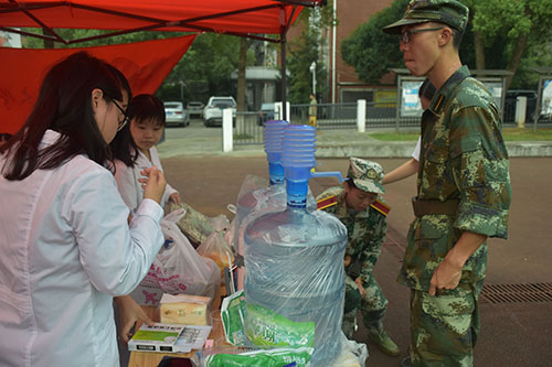 每年我院的爱心服务队会伴随新生军训一直到结束,志愿者们接受培训后轮番值岗,这是我院一大特色,既发挥了医学生的优势,更能让新生们感到我院的温情。