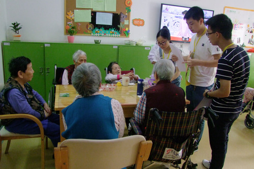 由医学社招募的15名志愿者集合到达了普亲先锋社区老年养护中心,护工人员将15名志愿者分为了两队,一队在四楼负责与老人们一起体会剪纸的乐趣,另一队只留三人分配到较为轻松的五楼与老人们一同玩耍。在折纸过程中,很多志愿者不约而同地选择了折纸船,用不同颜色的纸折出来的纸船也勾起了老人们对童年的记忆,老人们说:“这个我小时候折过,现在不记得了。”而在五楼,有身体仍然健朗的老人则拉起一位志愿者跳起了舞。一些志愿者为了逗坐在椅子上的老人们,她们拿起手机和老人玩起了有特效的自拍。