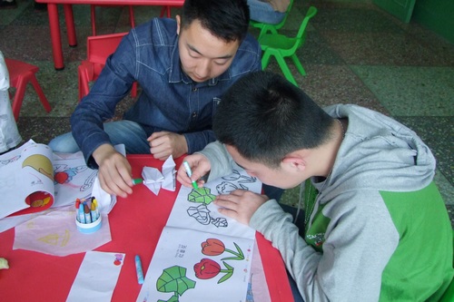抵达目的地后,志愿者们便迅速行动起来,在老师的安排下,采取一对一的形式陪伴“启音”的孩子们。活动初始,孩子们因不熟悉志愿者们,不愿意与志愿者交流,在志愿者的陪伴和指导下,大家的互动逐渐增多,孩子们根据模型用手上的橡皮泥捏出不同的造型,用画笔勾勒线条、上色,学习如何折小船、纸飞机等等。其中一个年龄稍大的孩子发声方式令人印象深刻,据老师介绍,是在到康复中心之前就养成了自己的发声方式,志愿者们教他识字发音,他也一直十分配合。最后,志愿者们和孩子们合影留念,至此,活动顺利结束。
