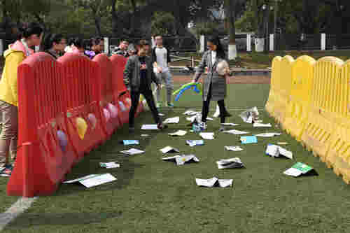 而线下活动也分为“地雷阵”与“保龄球”两个部分,在“地雷阵”中,同学们需要组队参加,由一名同学指路,另一名同学蒙着眼在阵中行走,不能碰到由纸片构成的“地雷”。在这个环节中,有许多的同学报名参加,但却少有人能完成游戏。原因在于蒙着眼的同学要从周围的声音中分辨出搭档的正确指令并前进到没有“地雷”的地方,并逐渐通过密集的“地雷阵”完成游戏,这非常考验同学之间的默契。而另一边的“保龄球”游戏就简单的多,参加游戏的同学只需要用手中的篮球砸倒可乐罐边就可以了,砸倒的罐子越多,获得的奖品也就越丰厚。