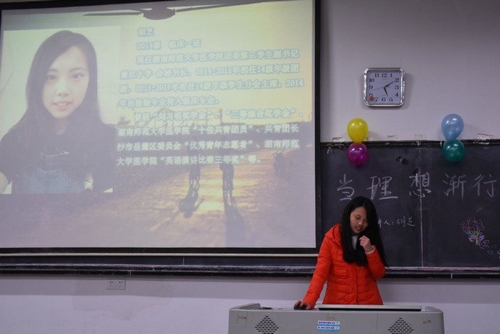 主持人简单致词后,很快步入讲堂正题。胡芝围绕“当理想与现实背道而驰时该怎么做?”这一话题进行演讲。她认为这可分三种情况,一:是否有努力去实现理想;二:个性与理想是否合适;三:是否理想太多无处安放?她通过播放“清华才女”张泉林的演讲,主要对第一种情况进行了说明,以此来告诫我院在场学生:成功是不会青睐没有准备的人,只有为理想做足了铺垫它才会实现。此外,胡芝还将自己在大学生参与两次暑假“三下乡”的经历与感触分享给现场观众,鼓励他们积极参与志愿活动,丰富、充实自己的课余生活,也许参与者会从中得到意想不到的收获与感动。讲堂结束,观众为主讲人送上一片掌声。