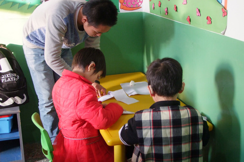 到达目的地后,经老师的安排,志愿者们拿出为听力障碍儿童准备的益智玩具和学习用具,采取“一对一”的交流方式开始活动。首先进行的是捏橡皮泥和画画活动,孩子们在志愿者的指导下,根据模型捏出不同的造型,拿着手中的画笔画出各式各样的人物,并在画本上写上自己的名字,现场的欢笑声不断。随后志愿者们帮助孩子们收拾内务,整理被子。活动最后,志愿者们与听力障碍儿童合影留念并挥手告别。