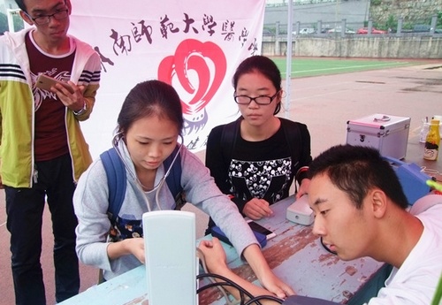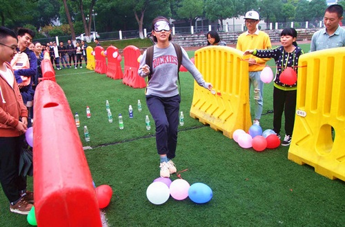 19日中午12时,主办方在我院田径场组织学生开展心理知识竞赛、测量血型血压、信任小游戏等活动。其中信任小游戏需两人组队,一人戴上眼罩,进入游戏场地,另一人在场外指导,让带上眼罩的人避开障碍,从起点走到终点,踩破气球才能成功完成游戏。尽管天空阴沉,细雨飘飘,但参加活动的人依然很多。活动期间,工作人员拍下了参加活动同学的各种美好笑容,并收集冲洗,于当日下午的微笑展览中在学校宣传栏旁展出,与同学们分享活动中的快乐,传播正能量。