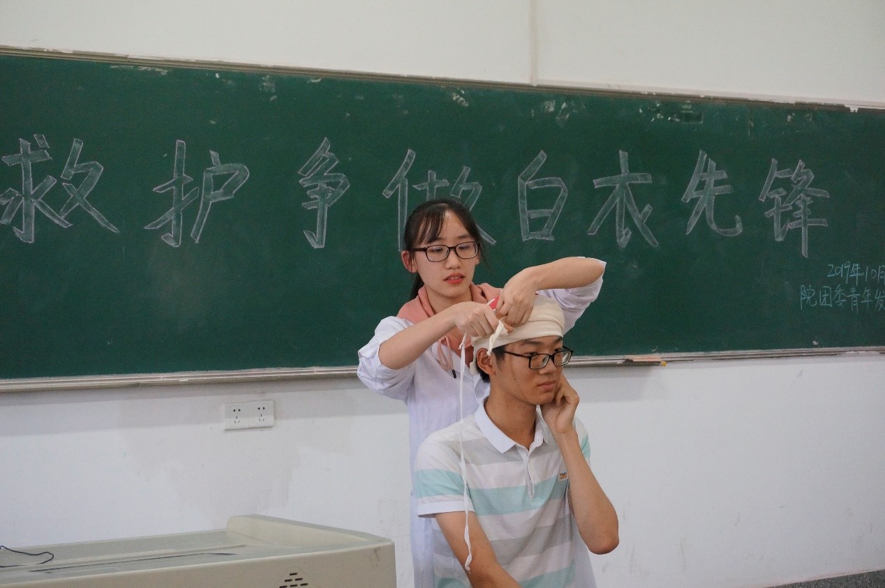 10月31日中午12点半,我院团委青年发展工作部于勤医楼八教室开展了以“学习医疗救护,争做白衣先锋”为主题的野平团校团课。知行合医健康知识宣讲团的成员贺玮、胡萍受邀作为此次团课的主讲人,技能班全体成员参与此次团课。