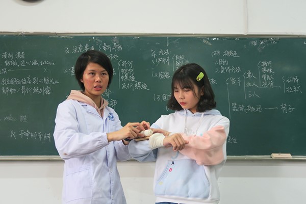 在主讲人进行简单自我介绍后,讲座正式拉开帷幕。车煜彤首先对常见伤害进行了详细讲解,重点介绍了电击枪、烧伤、冻伤、蛇咬伤、中暑、拉伤、溺水等伤害的分类、预防措施与急救方法,简要讲解了拨打急救电话时的说明要点及其顺序。紧接着,李淑娟结合实际操作,具体解说了止血、包扎、固定、搬运四项急救基本技术的目的及注意事项,现场演示了四项急救基本技术操作,并强调了现场急救的特点与原则。