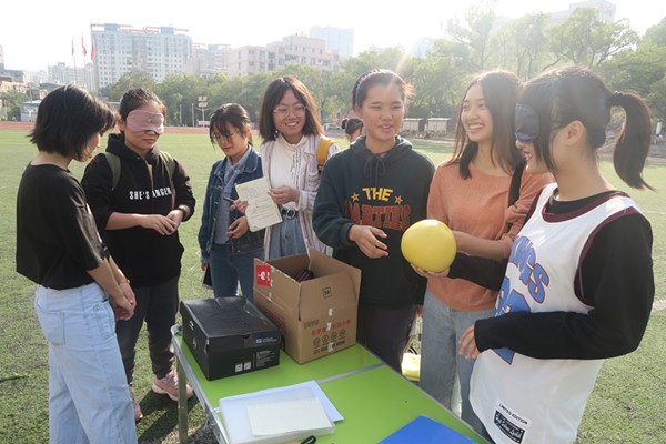 活动伊始,同学们分为四组,且三人组成一个小组。第一个项目开始后,四组的同学分别于四条路线上的出发点集合。各组选出一名同学戴上眼罩,另外两个同学在旁边引导其走过指定路线。在抵达线路的终点之后,戴眼罩的同学又在另外两个同学的帮助之下,经过了一段设有障碍物的盲道。顺利走过盲道之后,便是蒙眼写字和蒙眼猜字环节。活动过程中由蒙眼的同学写字,另外两个同学猜字。随后反过来,由另外两个同学在蒙眼的同学后背用手画字,让其正确猜出所描述的字。活动进入最后一个环节,由蒙眼的同学在一个装有很多物体的纸箱里,任意摸出一个物体,并猜出物体的名字,答对三个即可。接着是各组的三位同学一起进行关于志愿者及志愿者精神的答题。