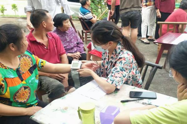 在测量血压时,队员们会询问在来之前是否做过剧烈运动、是否喝过刺激性饮料、是否在吃药和之前是否测过血压这四个问题,如若做过剧烈运动、呼吸急促,队员们建议村民在旁边休息十五分钟后再继续测量。其中对于一些血压偏高的村民,宣讲组队员们详细为他们介绍了高血压发生的相关因素及预防高血压的具体措施。